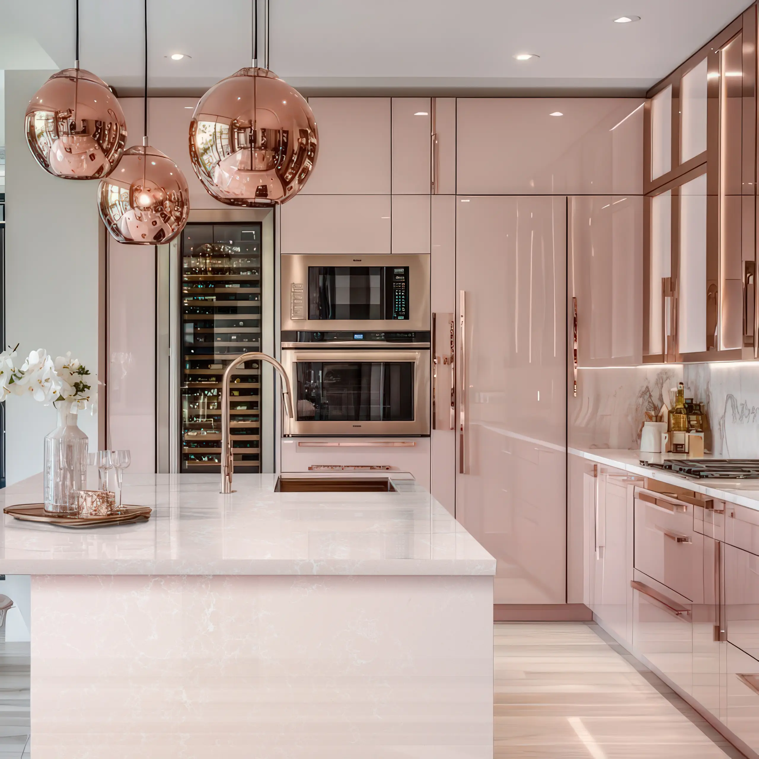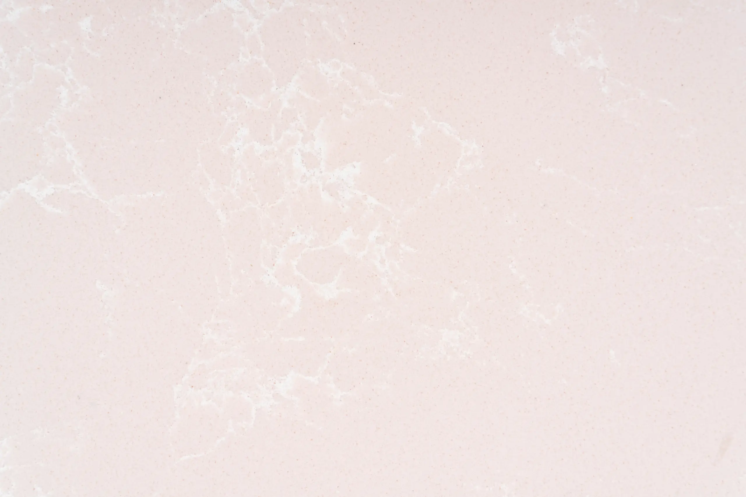 - Soft pastel pink quartz surface